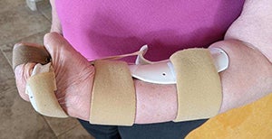 Because of the serious complicating factors of the nerve damage in Ruth Ann’s left shoulder, the OT specialist also designed and made custom-fitted splints for Ruth Ann to wear for many hours a day. The specialist also assigned different exercises and devices as Ruth Ann’s therapy needs evolved.